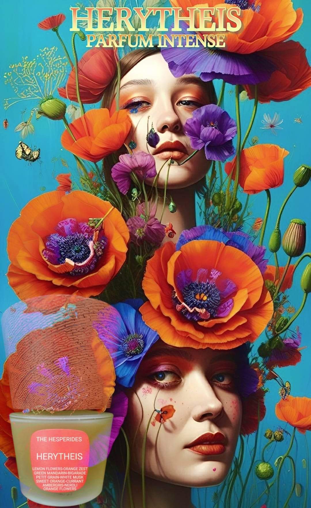 Il profumo agrumato HERYTHEIS è la descrizione olfattiva del mito della ninfa Eriteide.Nella linea THE MYTHOS PARFUM la famiglia THE HESPERIDES è identificata con tutti i profumi freschi agrumati ed Eriteide era una delle ninfe Esperidi che proteggevano l'albero dell'eterna giovinezza.HERYTHEIS era la signora in rosso,rappresentata sempre nell'attimo in cui offre i pomi d'oro dell'immortalità,nuda o con lunghissimi abiti di colore rosso intenso.Come le altre Esperidi Eriteide era anche custode di una parte del giorno,cioè quella che va dal tramonto alla sera,quando il sole ha perso il suo colore giallo intenso,è all'orizzonte e da arancio scuro diventa rosso e fa sembrare tutto rosso sia il mare che il cielo...per poi far posto alle prime ore della sera.La sua immagine è legata a tutta quella frutta rossa e dolce come arance e ribes;infatti la fragranza che la rappresentazione è a base di arance ed agrumi la cui polpa succosa è di un rosso arancio intenso e il suo aroma richiama quest'immagine di freschezza agrumata,raffinata,rossa,misteriosa