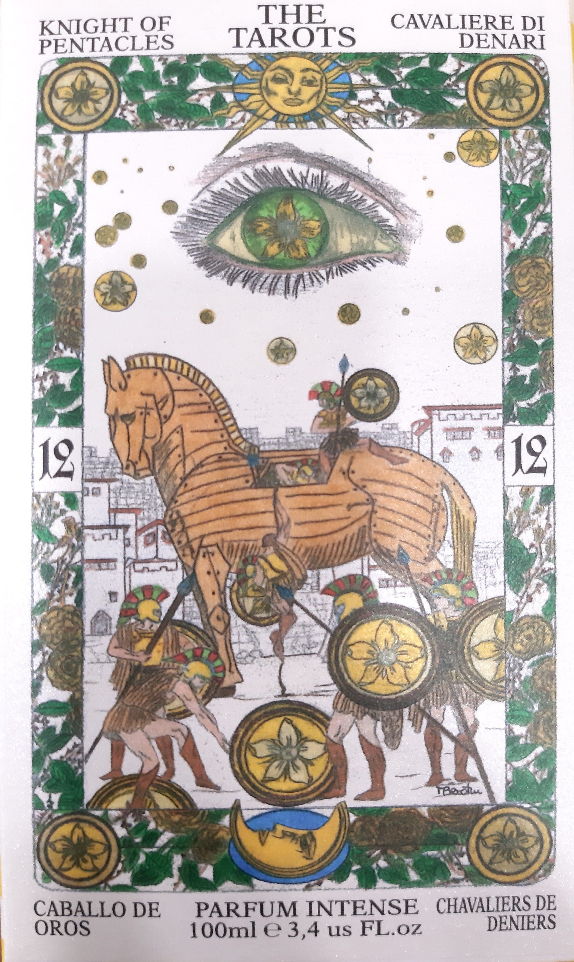 La persona che sceglie queste carta è molto affermata ma non realizzata completamente. Ha un largo dominio, della realtà circostante ma vorrebbe sempre qualcosa in più non per la cupidigia ma per una continua ricerca dell'armonia e della perfezione. Si tratta di una persona pratica e concreta con una gran voglia di lavorare con impegno e costanza. Soggetto affidabile e con la testa sulle spalle ha la capacità di portare avanti un progetto con forza e determinazione fino al raggiungimento e la conquista del risultato. L'artista nella rappresentazione grafica ha identificato il cavallo di denari con il famoso cavallo della città di TROIA; dove il cavaliere, uno dei più famosi della storia, cioè ULISSE, escogita questo espediente (di far nascondere i più valorosi soldati greci all'interno del cavallo da loro costruito), per espugnare l'inataccabile città! Simbolo assoluto di cavalieri perseveranti ed impegnati all'inverosimile per raggiungere il risultato, questa leggenda rappresenta perfettamente il carattere di chi sceglie questa carta: intelligente, astuto, perseverante! Ma come si vede nell'opera d'arte una presenza dall'alto osserva; aiuta i greci(in questo caso è ATENA) ...anche il consultante spesso per la troppa praticità si blocca e ha bisogno di un aiuto per raggiungere i risultati prefissati. Quindi ogni tanto dovrebbe distogliere gli occhi dal suo elemento terra e dalle cose tangibili e guardare in alto!