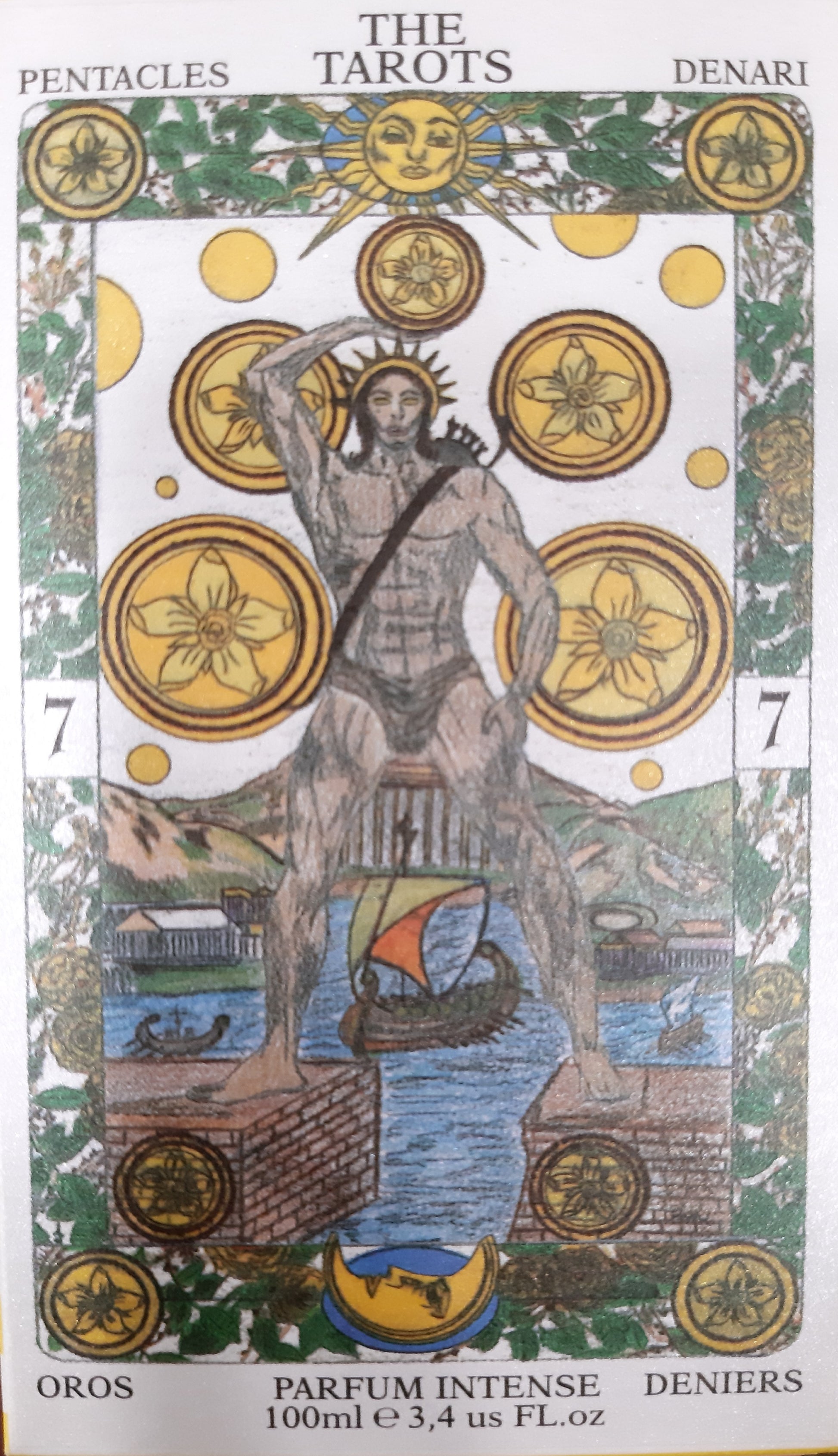 La carta profumo del SETTE DI DENARI dei semi degli arcani minori delle denari della linea di profumeria artistica THE TAROTS PARFUM significa:fortuna, creazione,potere.Questa carta significa fortuna in tutti i campi:lavoro,amore e studio.Chi sceglie questa carta è portato a concludere buoni affari,ad avere successo e ad ereditare piccole fortune. Il SETTE DI DENARI simboleggia l'energia di Venere,la bellezza fisica e l'attrazione verso il bello,verso la perfezione.Questo arcano è stato rappresentato dall'artista da una delle sette meraviglie del mondo antico cioè il favoloso e mitico:COLOSSO DI RODI.Costruita all'entrata dell'isola di Rodi,questa statua gigantesca,fungeva da faro per illuminare il mare ma allo stesso tempo rappresenta la bellezza e la perfezione degli abitanti della città e anche l'armonia sociale che si viveva nell'isola ritenuta il paradiso sulla Terra.Settima meraviglia del mondo antico,sette è il numero della perfezione e questa città era abitata dagli uomini e dalle donne più belle al mondo e tutti vivevano in pace,in un benessere unico. Il Colosso di RODI rappresentava la perfezione divina resa umana.Il messaggio di questa carta è che la persona che la sceglie è estremamente bella sia fuori che dentro;addirittura ciò che si vede fuori,che è già molto,è poco rispetto a ciò che si troverà all'interno.